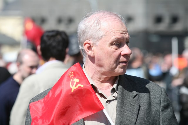 Kommunistide meeleavaldus Moskvas, FSB hoone ees. Mees lipuga.
