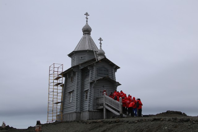 Turistid külastamas Bellingshauseni baasis asuvat Vene Kolmainsuse Kirikut